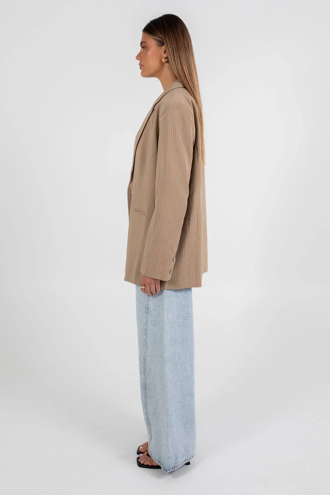 Classic tailored design boyfriend blazer for the modern woman. Beige + white pinstripe fabrication.