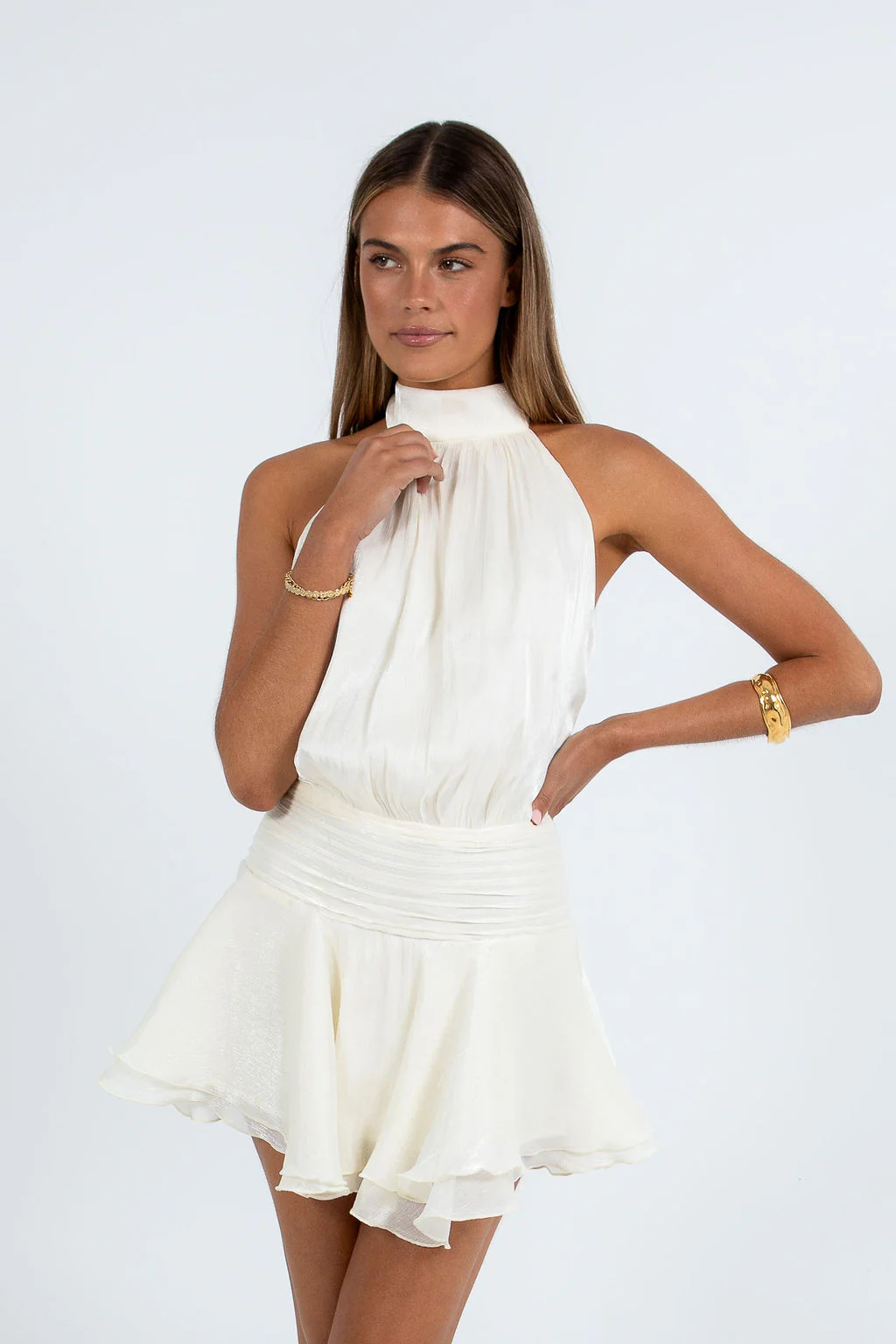 Flattering mini length halter dress in a cream shimmery hue.Â