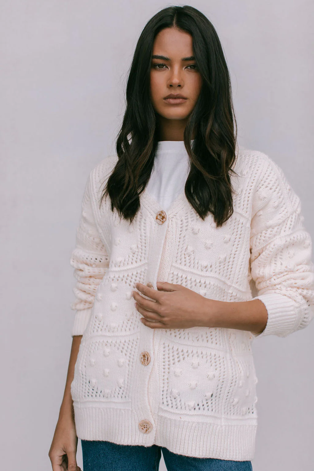 Fall in love with Riya, a timeless + versatile knit cardigan. Showcasing a creamy hue + textured knit details, she is essential is perfect for effortless style. With a relaxed silhouette, she is the ultimate wardrobe staple.