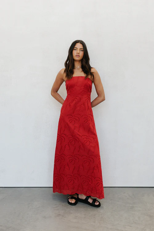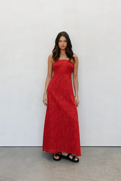 Meet our Samantha Maxi Dress, a striking red, broderie anglaise fabric maxi sure to turn heads. With her strapless neckline, fitted bust + classic a-line silhouette, she offers a flattering fit. Be bold + standout in Samantha.