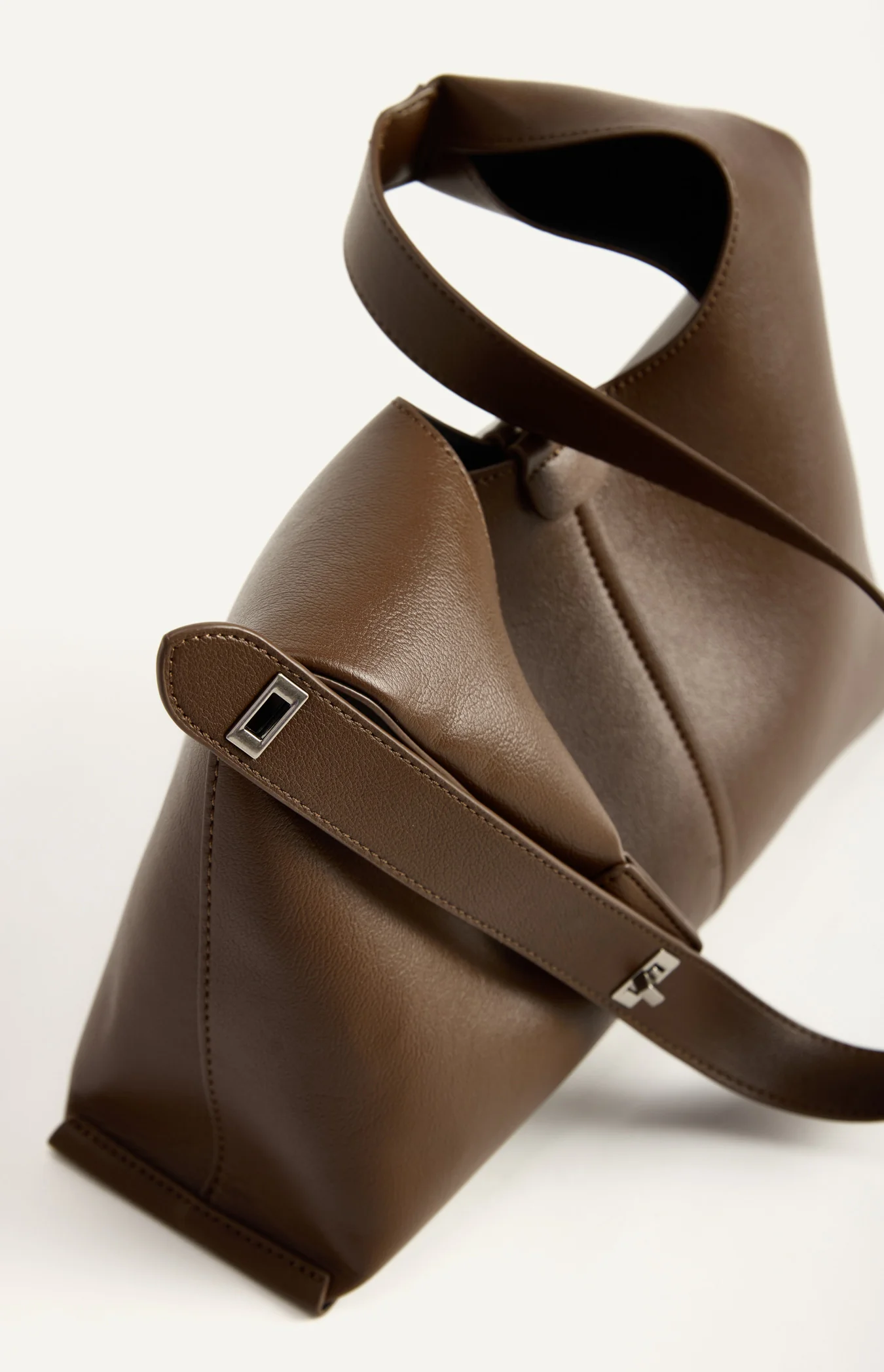 Classic + timeless slouchy shoulder bag. Espresso brown faux leather look.