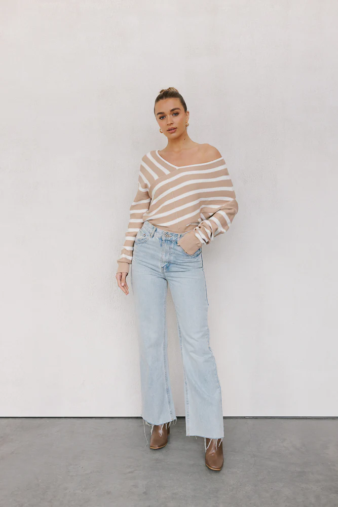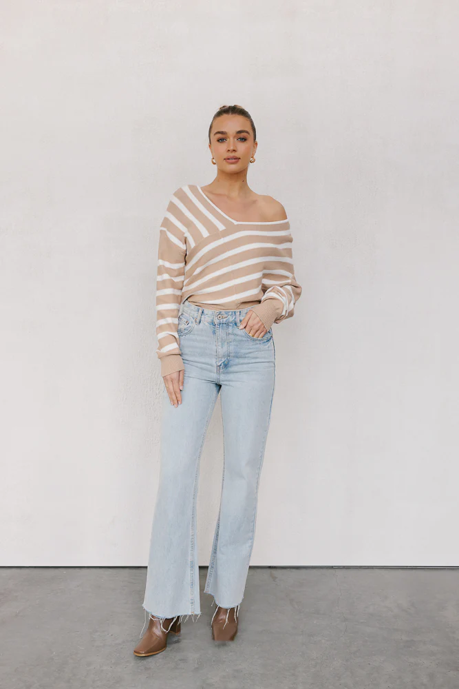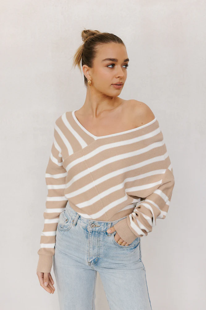 Our Siennah Jumper is a chic, stylish knit featuring classic stripes in neutral hues, sure to exude timeless charm. A wide v-neckline + asymmetrical design adds contemporary flair, ensuring comfort without compromising on style.