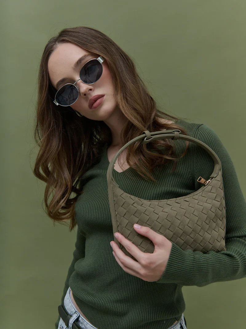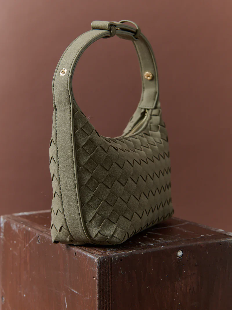 Our Cleo Bag blends elegance + practicality with its woven texture + luxe vegan suede finish. Boasting a versatile khaki green hue +Ā gold hardware, this chic handbag is perfect for elevating any outfit with timeless style.