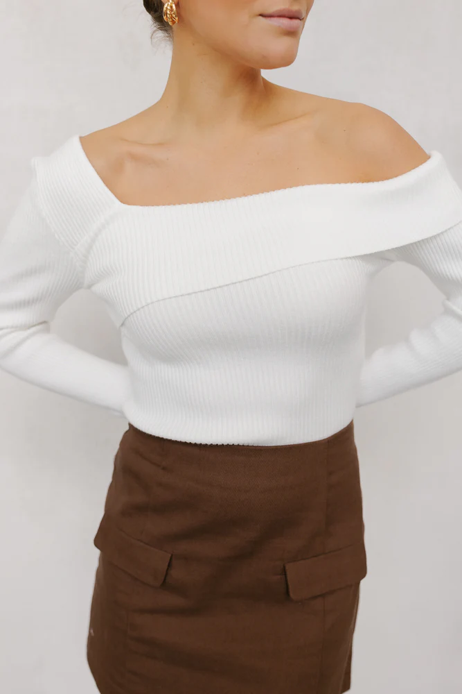 Our Tarah Top is a classic essential every girl needs. Boasting a white ribbed knit fabrication + an asymmetrical folded neckline, she is sure to style effortlessly into your wardrobe.