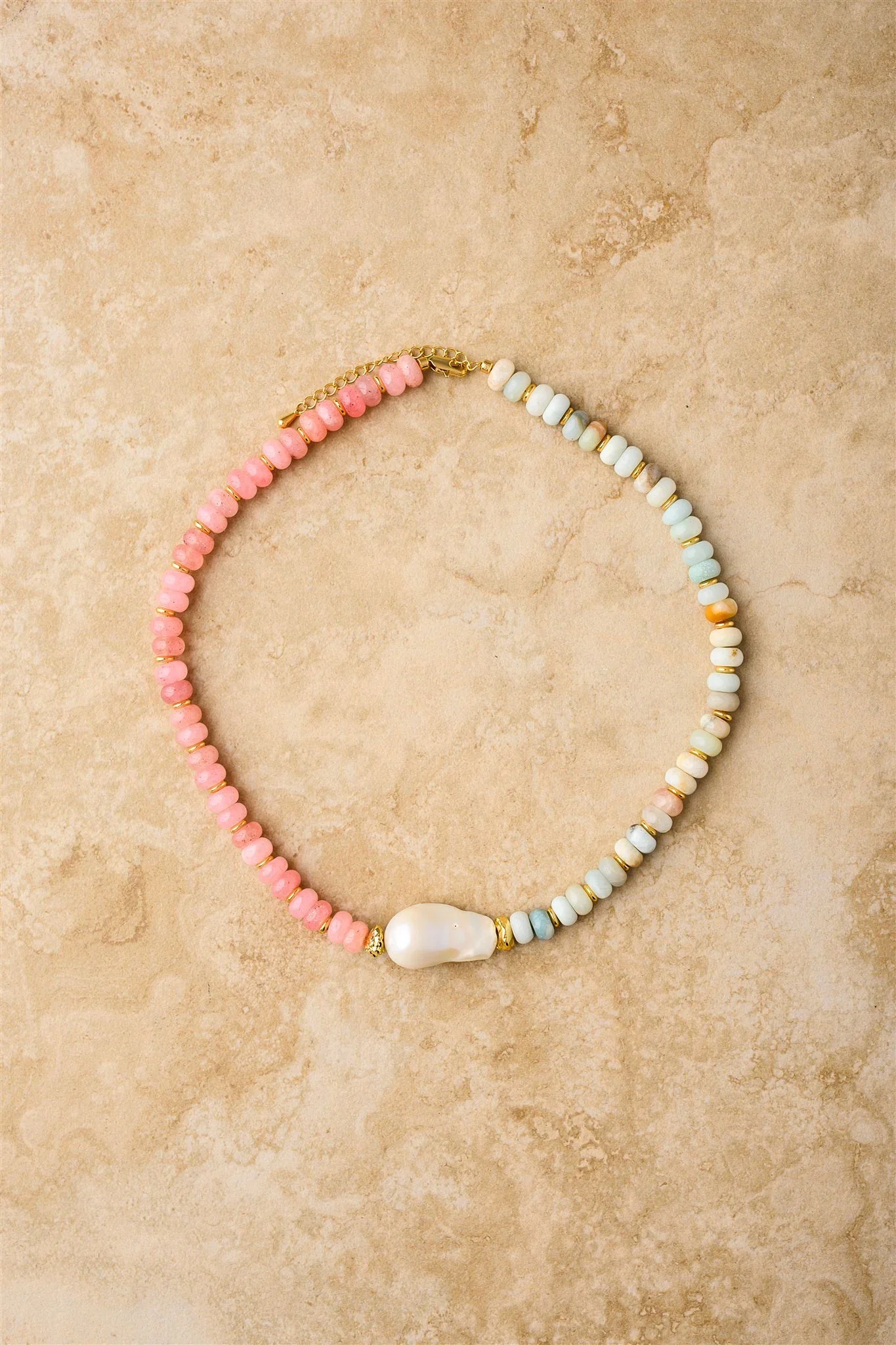Pink Opal + Amazonite Stones with the addition of a freshwater pearl. An essential summer statement.
