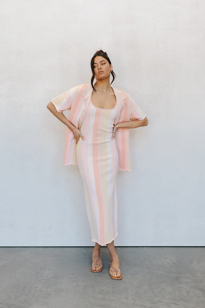 Our Turin Midi Dress by Cinque is a statement in modern style with a playful twist. Featuring a fitted silhouette + sweet sorbet-hued stripes in yellow, melon + beige, this knitted dress combines flattering structure with fresh, fun energy.