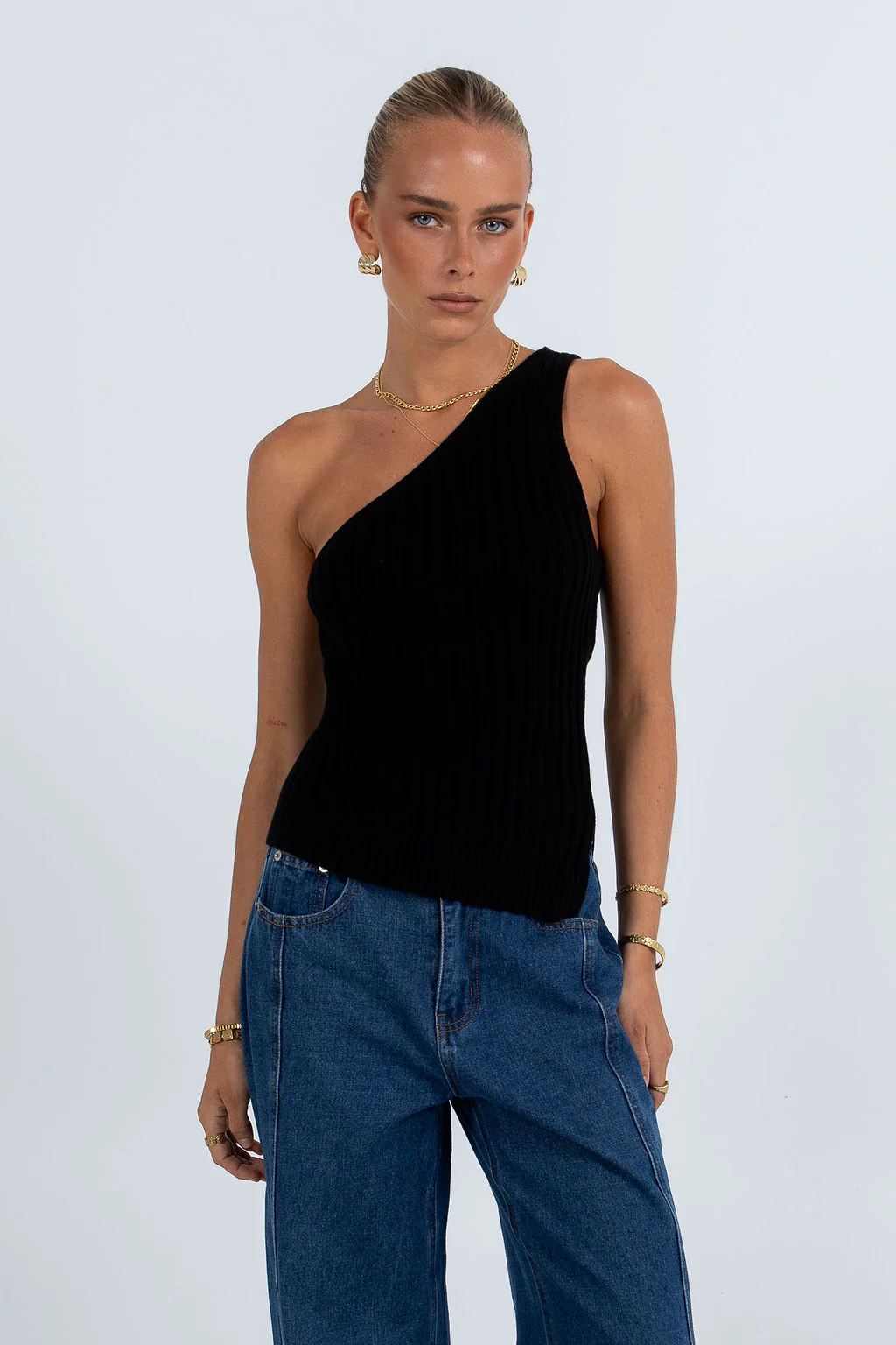 Classic black knitted top. Boasting a flattering asymmetrical tank top design.