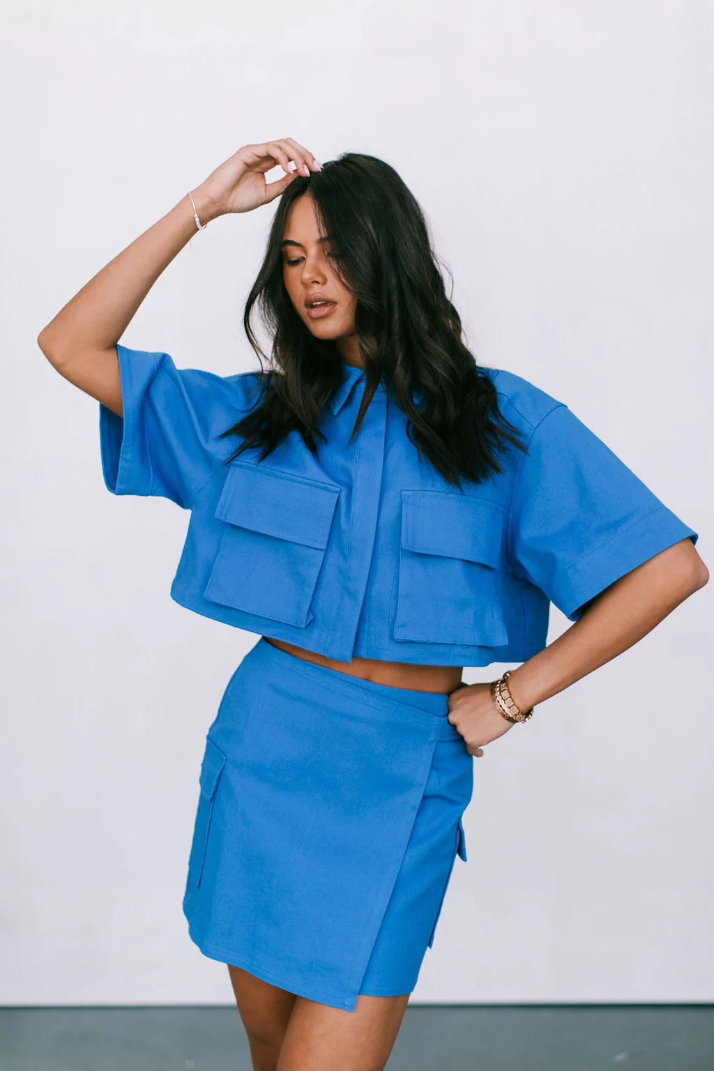 Discover the Valtos Skirt, a chic cobalt blue utility mini that elevates your wardrobe with its contemporary design. This mini-length skirt features a mid-to-high waist fit & an A-line silhouette for a flattering shape.