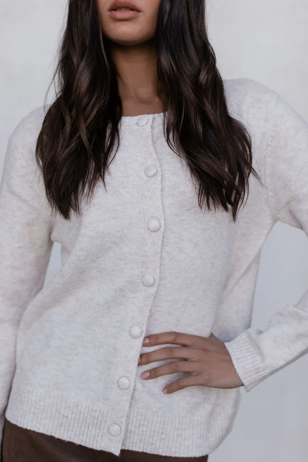 Soft, sweet + effortlessly classic - our Vanessa Knit Cardigan is a wardrobe staple youāll reach for on repeat. Crafted in a beige marle knit with fabric-covered buttons + a relaxed silhouette, itās the perfect cosy layer for everyday styling.