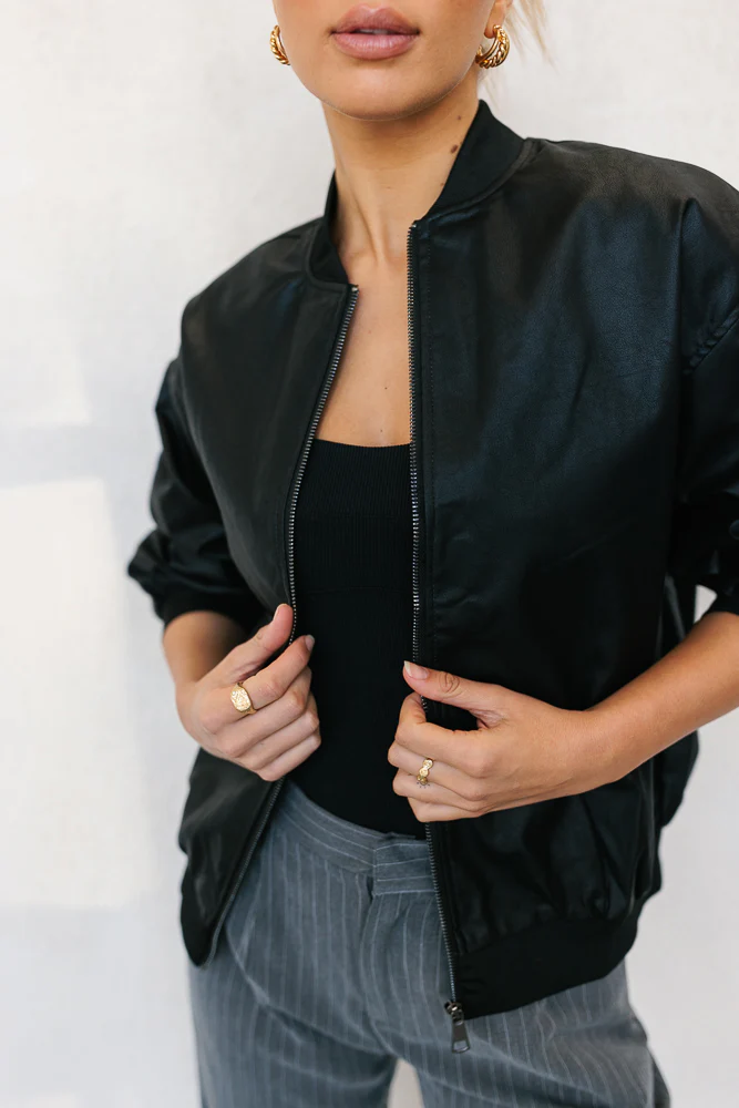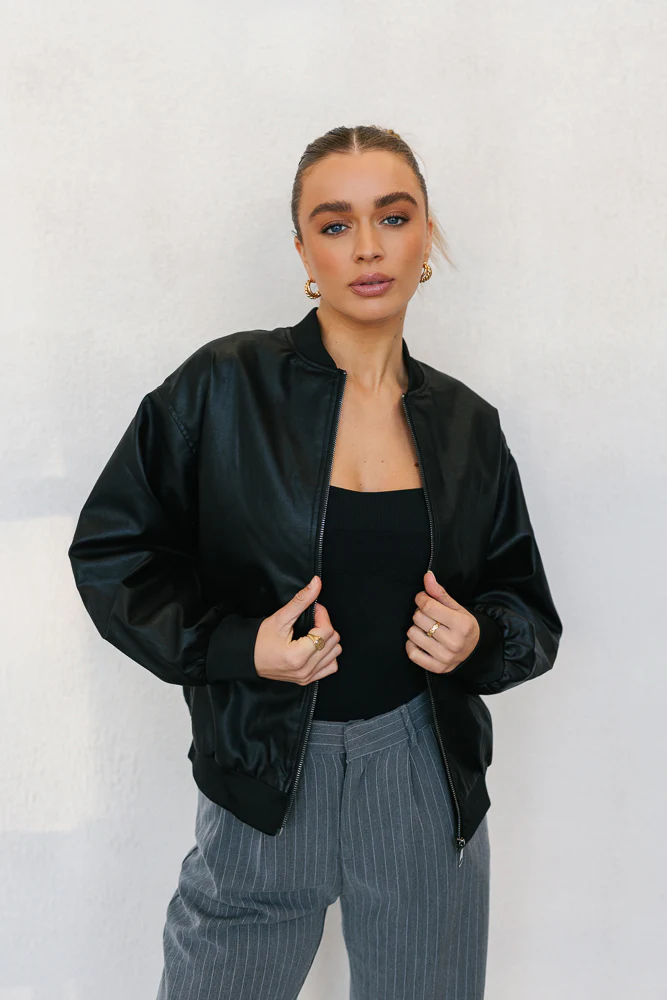 Meet our Waldorf Jacket, a cool + casual black leather look bomber jacket that is sure to combine style + comfort. Designed for a modern, laid-back vibe with a relaxed silhouette, Waldorf is a versatile addition to any girls wardrobe.