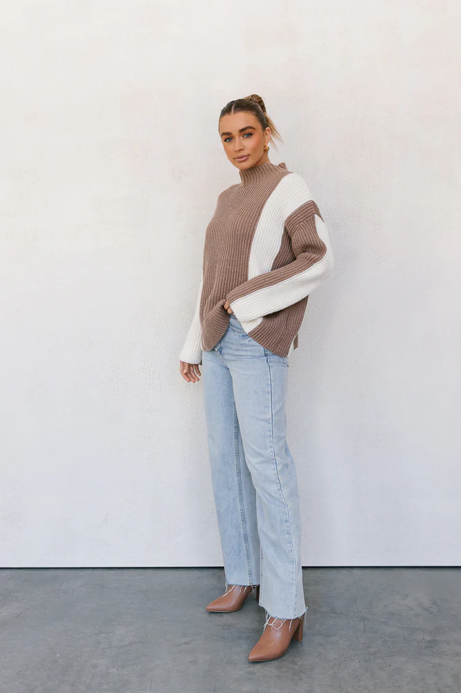 Our Zarli Jumper boasts a trendy + cozy essential for your wardrobe. This two-tone contrast mocha + cream knit adds a touch of style to your look. With her high funnel neckline + ultra-oversized fit, she creates a chic + contemporary look.