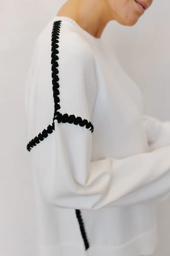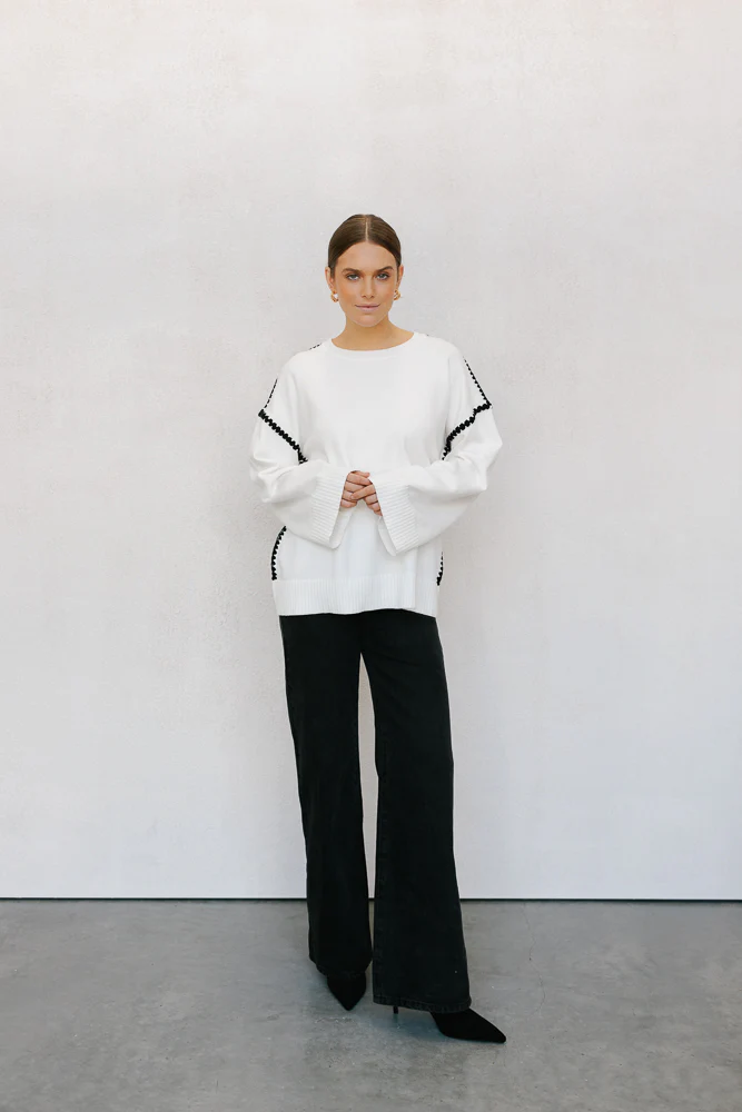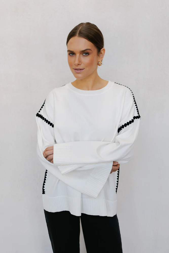 Our Lori Jumper is a perfect blend of comfort + style. This oversized, boxy white knit features black stitching detail embodies a relaxed silhouette + ultra-dropped shoulders with wide sleeves for an effortlessly chic look.